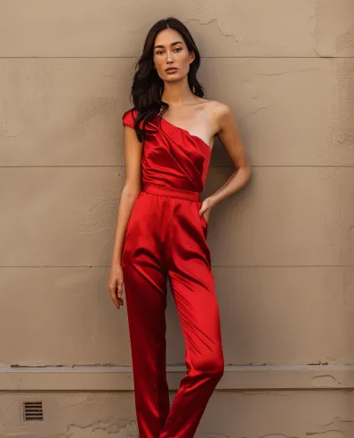 This stunning red satin jumpsuit is the perfect blend of elegance and modern style. Featuring an asymmetrical one-shoulder design and tailored fit, it s effortlessly chic and flattering. The high-waisted trousers elongate the legs, while the satin fabric adds a touch of glamour. Gold strappy heels complete the look, giving it a luxurious finish.