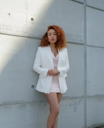 This outfit pairs a soft blush mini dress with a tailored white blazer, creating a chic and sophisticated vibe. The fitted mini dress flatters the figure, while the oversized blazer adds structure and a modern edge. Paired with nude pointed-toe heels, this ensemble strikes the perfect balance between feminine and powerful.