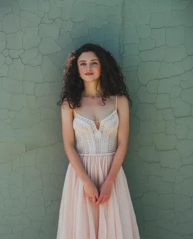 This look features a dreamy blush midi dress with a delicate lace bodice and soft, flowy tulle skirt. The dainty spaghetti straps and subtle sweetheart neckline create a gentle, feminine silhouette, while the light, breathable fabric keeps it comfortable and airy. It’s the perfect blend of elegance and simplicity, making it ideal for a Valentine’s Day date.