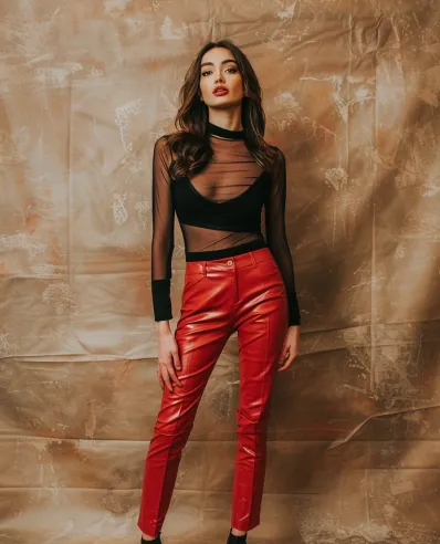 This look is pure fire! The combination of red leather and a sheer black top is daring, modern, and unapologetically fierce. It s the kind of outfit that says, I m here to break hearts⦠in style.â The leather pants bring all the attitude, while the sheer top keeps things a little sultry without being over-the-top. If you re going for confidence and edge, this is the look for you.