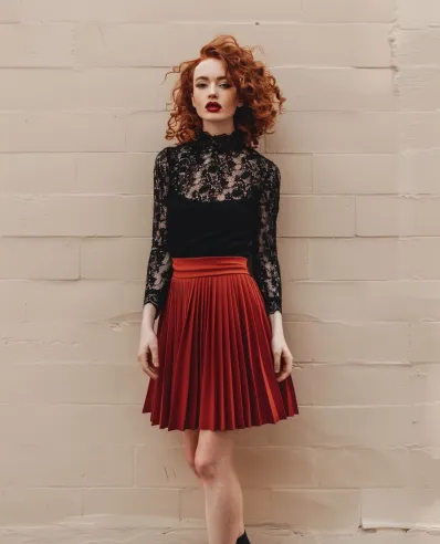 This outfit pairs a delicate black lace top with a high neckline and long sleeves, exuding vintage elegance, with a bold red pleated skirt that s full of movement and flair. The intricate lace adds a touch of mystery, while the skirt keeps the vibe youthful and fun. Finished with sleek black ankle boots and a confident pop of red lipstick, this look blends romance with a dash of rock-and-roll attitude.