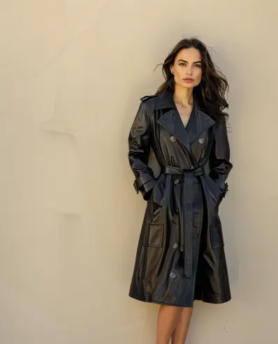 This outfit features a sleek black faux-leather trench coat with a belted waist, giving it a structured and polished silhouette. The glossy finish of the coat adds a modern, edgy vibe, while the bright red ankle boots bring an unexpected pop of Valentine s flair. It s a striking combination that s as bold as it is stylish.