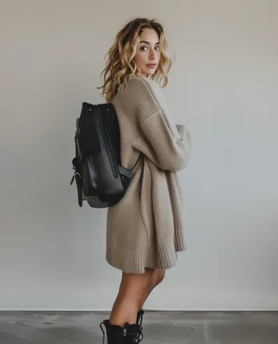 This look is all about balancing cozy comfort with a touch of edgy flair. The oversized beige sweater dress creates a soft, warm silhouette that s perfect for cooler days. Pairing it with chunky black moto boots adds a bold, contrasting edge, making the outfit stand out in the best way. The sleek black backpack is not only practical but also complements the boots beautifully, tying the outfit together while keeping things casual yet chic.