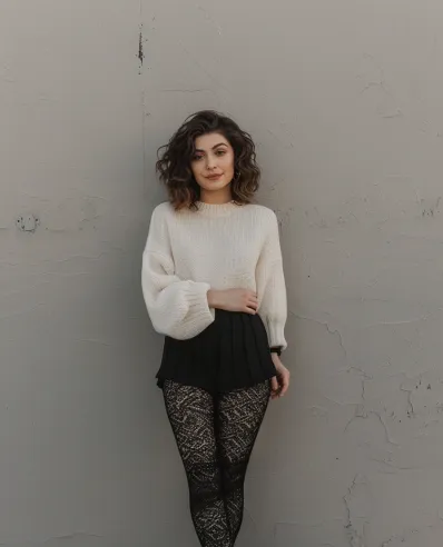 This outfit is all about playing with texture for a chic and cozy vibe. The cream-colored knit sweater with its balloon sleeves creates a soft, relaxed look, perfect for cooler days. Paired with a black pleated mini skirt, the silhouette is playful and flirty. The patterned tights add an extra layer of visual interest, while the black moto boots bring just the right amount of edge to balance the outfit.