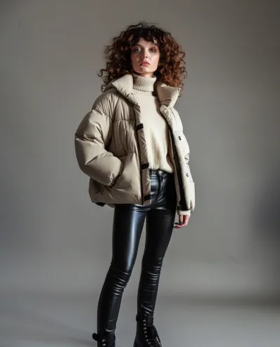 This outfit is winter chic done right! The oversized beige puffer jacket provides warmth while adding a modern, trendy vibe. Underneath, a cream turtleneck sweater creates a soft and cozy contrast against the edgy black faux leather leggings. To complete the look, chunky lace-up moto boots bring boldness and practicality, making this ensemble perfect for colder weather while staying effortlessly stylish.