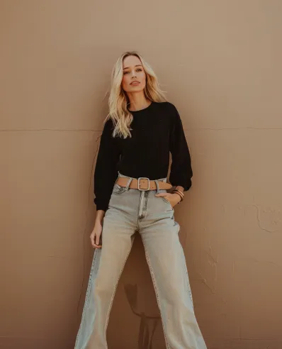 This outfit is all about laid-back sophistication with a touch of edge. The high-waisted light-wash jeans, with their wide-leg silhouette and rolled cuffs, bring a vintage-inspired vibe that s effortlessly cool. A cropped black sweater adds a modern, fitted touch to balance the loose denim, while the tan belt highlights the waist for a structured finish. The sleek black moto boots complete the look with just the right amount of attitude, making it both practical and stylish.