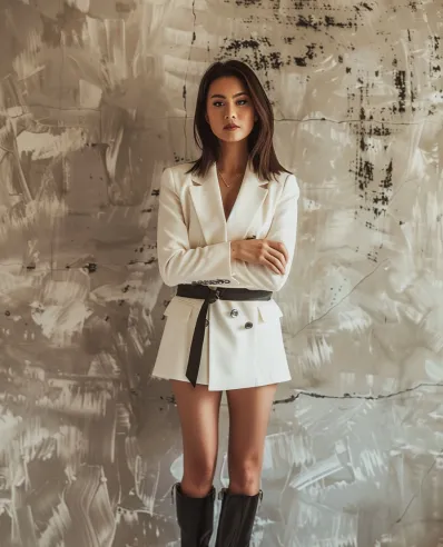 This outfit is all about power dressing with a touch of edge. The crisp white blazer dress, cinched at the waist with a black belt, creates a bold and structured silhouette that exudes sophistication. Its tailored fit and minimalist design keep the look clean and modern. Adding a pair of tall black moto boots brings an unexpected, edgy twist, making the ensemble strikingly contemporary.