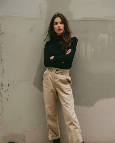 This outfit is effortlessly refined, combining clean lines with understated edge. The beige high-waisted trousers, featuring a tailored cut and slightly cropped length, exude sophistication while keeping things relaxed. Paired with a fitted black turtleneck, the outfit creates a sleek and timeless silhouette. The minimalist black moto boots anchor the look, adding a subtle toughness that balances the polished vibe perfectly.