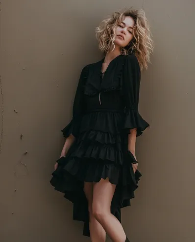This outfit combines gothic romance with an edgy twist. The layered black ruffled dress brings dramatic flair with its high-low hemline and flowy, bell-sleeved design. Its feminine details make it feel whimsical and bold all at once. Paired with classic lace-up moto boots, the outfit balances delicate charm with tough-girl energy, creating a look that s both striking and wearable.