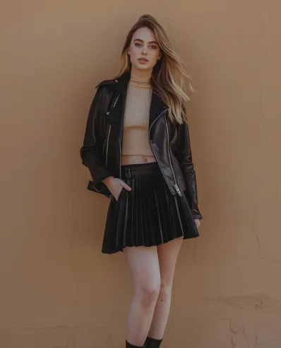 This outfit is the perfect mix of girly and edgy! The high-waisted black pleated skirt gives off a playful, preppy vibe, while the cropped beige turtleneck sweater adds a touch of softness and warmth. Layered over it, the black leather moto jacket injects that effortless cool factor. The sleek black moto boots anchor the look with their chunky heel and tough-but-chic vibe, making this outfit both flirty and fearless.