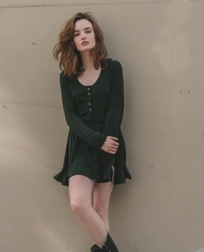 This outfit is effortlessly charming with its simple yet flirty vibe. The forest green long-sleeve dress, with its flowy hem and buttoned detail, feels fresh and feminine without being overdone. The cinched waist adds just the right amount of shape, making it flattering and easy to wear. Paired with sturdy black lace-up moto boots, the outfit strikes a perfect balance between delicate and edgy.