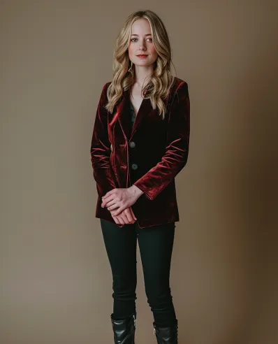 This outfit is a perfect blend of classic elegance and edgy charm. The rich burgundy velvet blazer brings a touch of luxe sophistication, making it an instant statement piece. Paired with black skinny jeans, the silhouette stays sleek and refined. The pointed-toe black moto boots add a unique, modern edge, giving the ensemble just the right amount of attitude without losing its polished vibe.