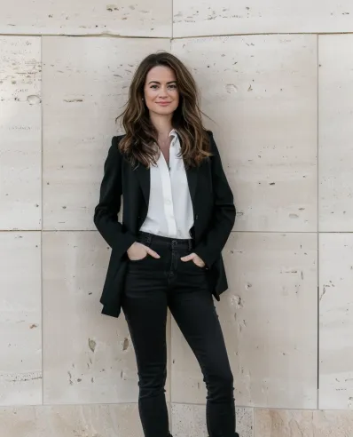 This outfit redefines business casual with its polished yet edgy vibe. The tailored black blazer paired with slim black jeans creates a sharp, elongated silhouette. A crisp white button-up shirt tucked in perfectly balances the professional and casual elements. The heeled moto boots take this ensemble to the next level, adding a bold and modern twist to an otherwise classic outfit. It s sophisticated, stylish, and effortlessly cool.
