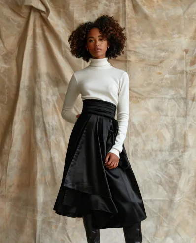 This outfit is a masterclass in mixing elegance with edge. The flowing black satin skirt creates a dramatic, luxurious feel with its high-waisted silhouette and subtle sheen. Paired with a fitted white turtleneck, it keeps the look refined and sophisticated while highlighting the waistline. To complete the ensemble, the sleek black moto boots add a modern, edgy contrast that grounds the elegance of the skirt.
