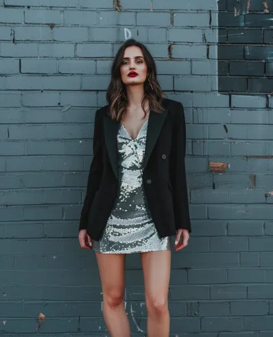 This outfit is a stunning mix of glamour and edge. The silver sequin mini dress catches the light beautifully, making it perfect for a night out or party. Layered with a tailored black blazer, it adds structure and sophistication to the glitzy base. The sleek black moto boots anchor the look, creating a bold, unexpected pairing that balances the feminine sparkle with a touch of rebellious flair.