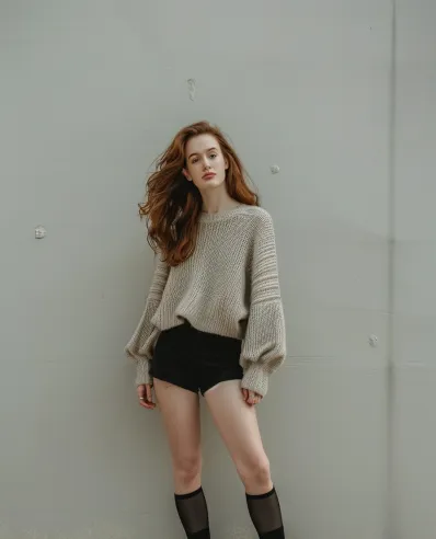 This outfit strikes a perfect balance between cozy and bold. The oversized beige knit sweater, with its soft texture and balloon sleeves, adds warmth and a touch of casual chic. Paired with black high-waisted shorts, it keeps the look playful and edgy. The knee-high sheer socks layered with chunky lace-up moto boots create an unexpected and trendy vibe, adding depth and attitude to the outfit.