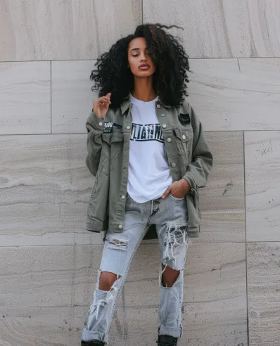 This outfit perfectly blends rugged charm and laid-back streetwear vibes. The oversized olive-green utility jacket, complete with patches and a relaxed fit, gives off major military-inspired energy. Underneath, a graphic white tee keeps things casual yet cool. The light-washed, ripped jeans add just the right amount of distressed detail, creating a lived-in, effortless feel. Of course, the moto boots steal the show with their sturdy design, polished finish, and no-nonsense attitude, tying the whole ensemble together like a pro.