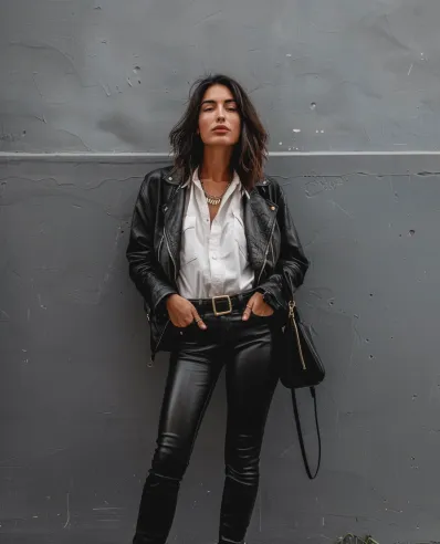 This outfit screams confidence and coolness with its mix of textures and timeless staples. A structured black leather jacket, paired with sleek faux-leather leggings, creates a chic, monochromatic base. The crisp white button-up shirt tucked into the high-waisted leggings adds just the right amount of sophistication, while the chunky lace-up moto boots ground the entire look with their edgy, utilitarian vibe. The gold belt buckle and layered necklace bring a touch of shine, and the minimal black crossbody bag ties everything together effortlessly.