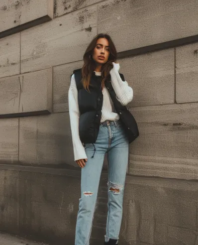 This outfit is the ultimate blend of cozy and stylish. The ripped light-wash jeans keep it casual, while the white knit sweater adds warmth and texture. The black puffer vest is not only practical but also adds an effortlessly cool, layered vibe. Of course, the chunky black moto boots bring it all together, giving the look a bold and modern edge.