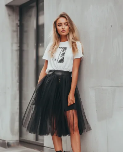 This outfit takes femininity and turns it on its head in the coolest way possible. The black tulle skirt adds a whimsical, ballerina-inspired touch, while the high-waisted design keeps it sleek and flattering. Paired with a casual white graphic tee tucked in, the outfit creates a perfect balance of playful and edgy. The black lace-up moto boots ground the look with their bold, no-nonsense vibe, making this combo equal parts sweet and fierce.