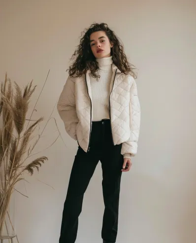 This outfit combines cozy layers with clean, minimalist vibes. The cream-colored quilted jacket adds texture and warmth, while the fitted white turtleneck brings a classic, polished touch. Slim black pants provide a tailored base, making the silhouette sleek and flattering. The shiny black moto boots add just the right amount of edge, balancing the softness of the jacket with a bold, modern finish.