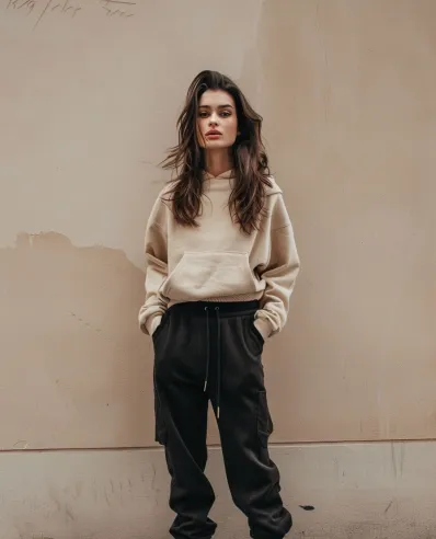 This outfit is the ultimate in casual chic! The oversized beige hoodie brings that cozy, laid-back vibe we all crave, while the black jogger pants keep things sleek and stylish with their tapered fit and drawstring detail. The chunky black moto boots inject an unexpected edge into this athleisure-inspired look, making it perfect for turning heads while staying comfy.