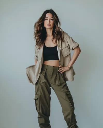 What I adore about this outfit is how it blends function and fashion seamlessly. The cargo pants make you feel ready for an adventure (or at least ready to carry all your essentials without a bag), while the moto boots give you that extra edge of confidence. The cropped tank keeps it fresh and flirty, and the oversized jacket is just begging for a casual, windswept photo moment. It s rugged yet refined, and let s be real, who doesn t love a good pocket situation?