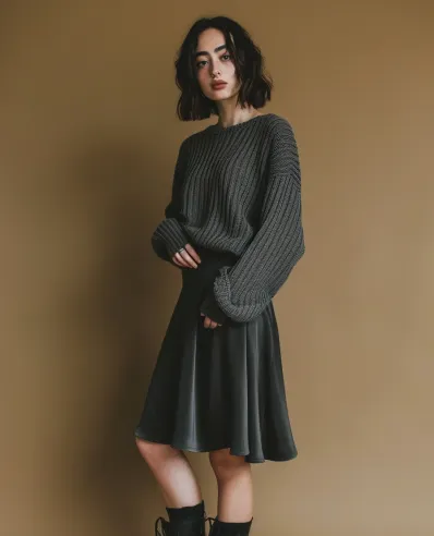 This outfit beautifully combines cozy and edgy elements. The oversized gray knit sweater with its chunky texture creates a relaxed and warm vibe, perfect for cooler days. Paired with a flowy, black leather-look skirt, the ensemble balances softness with a hint of drama. To finish it off, the chunky lace-up moto boots bring a bold, grounded touch that adds personality and attitude to the look.